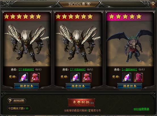 玩家可以通过刷新任务获得高星级的悬赏,击杀BOSS即可获得奖励。